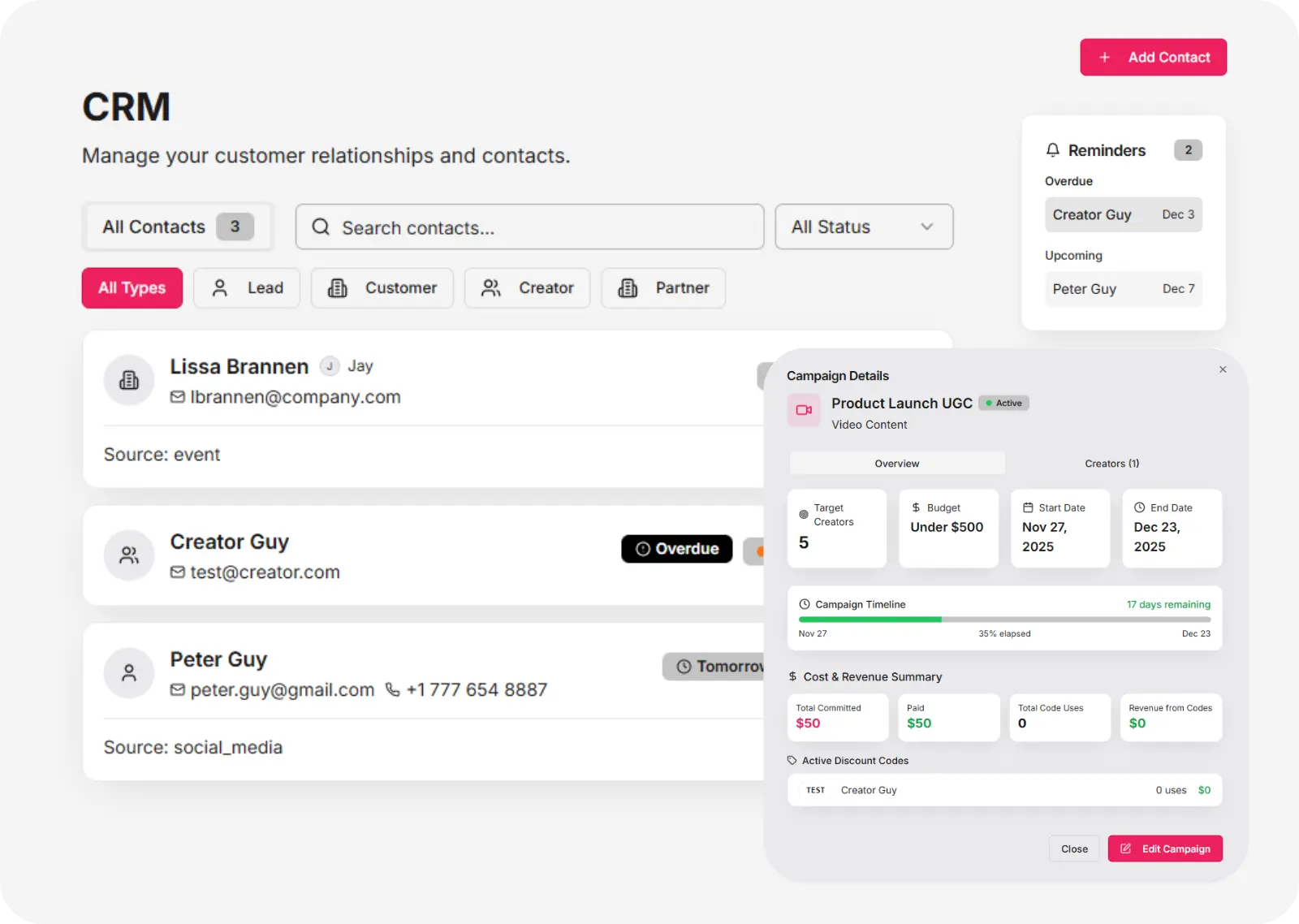 Turn approved ideas into platform specific posts and keep track of creators, partners, and key contacts. Stay organized as content moves from planning to execution.
