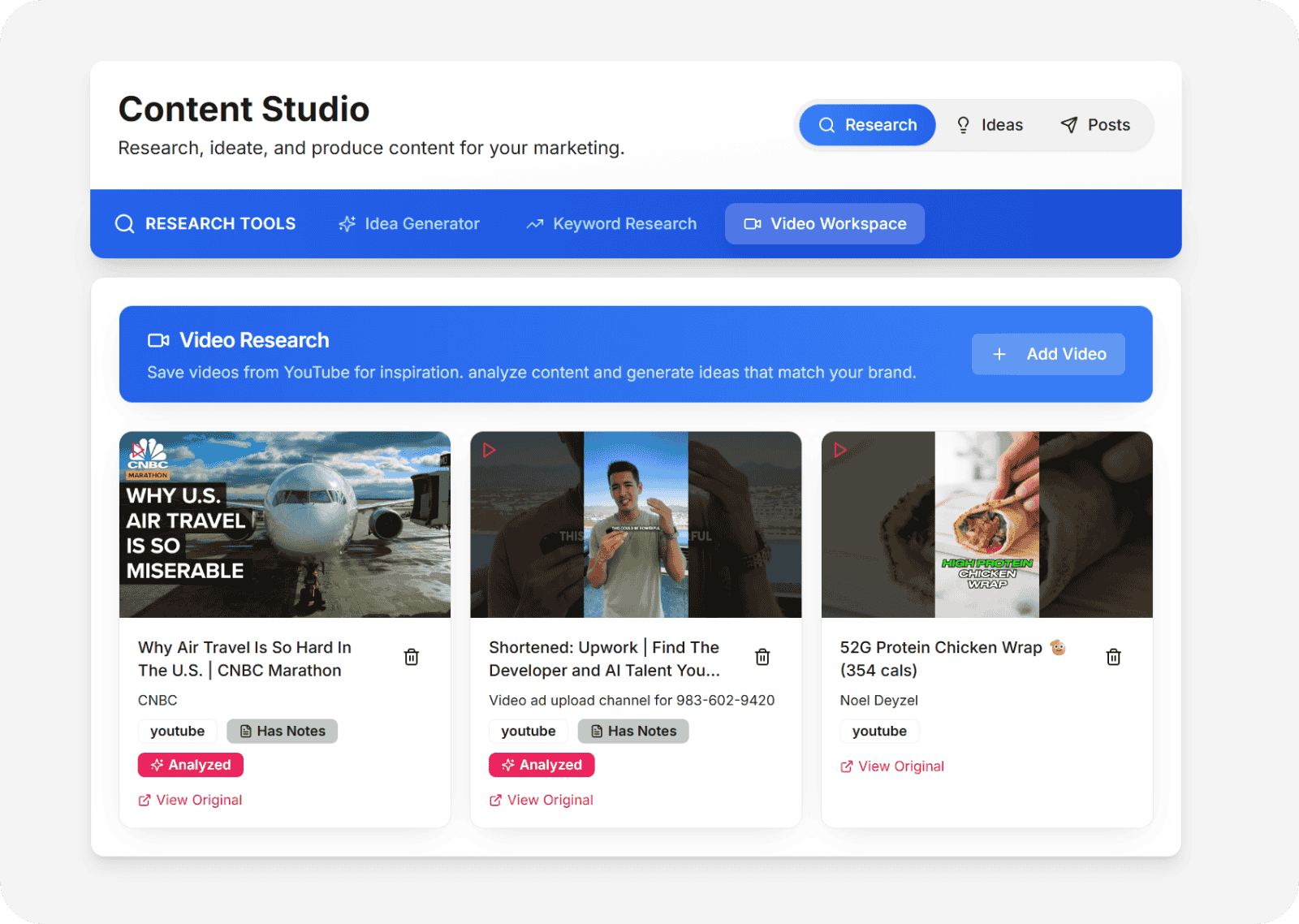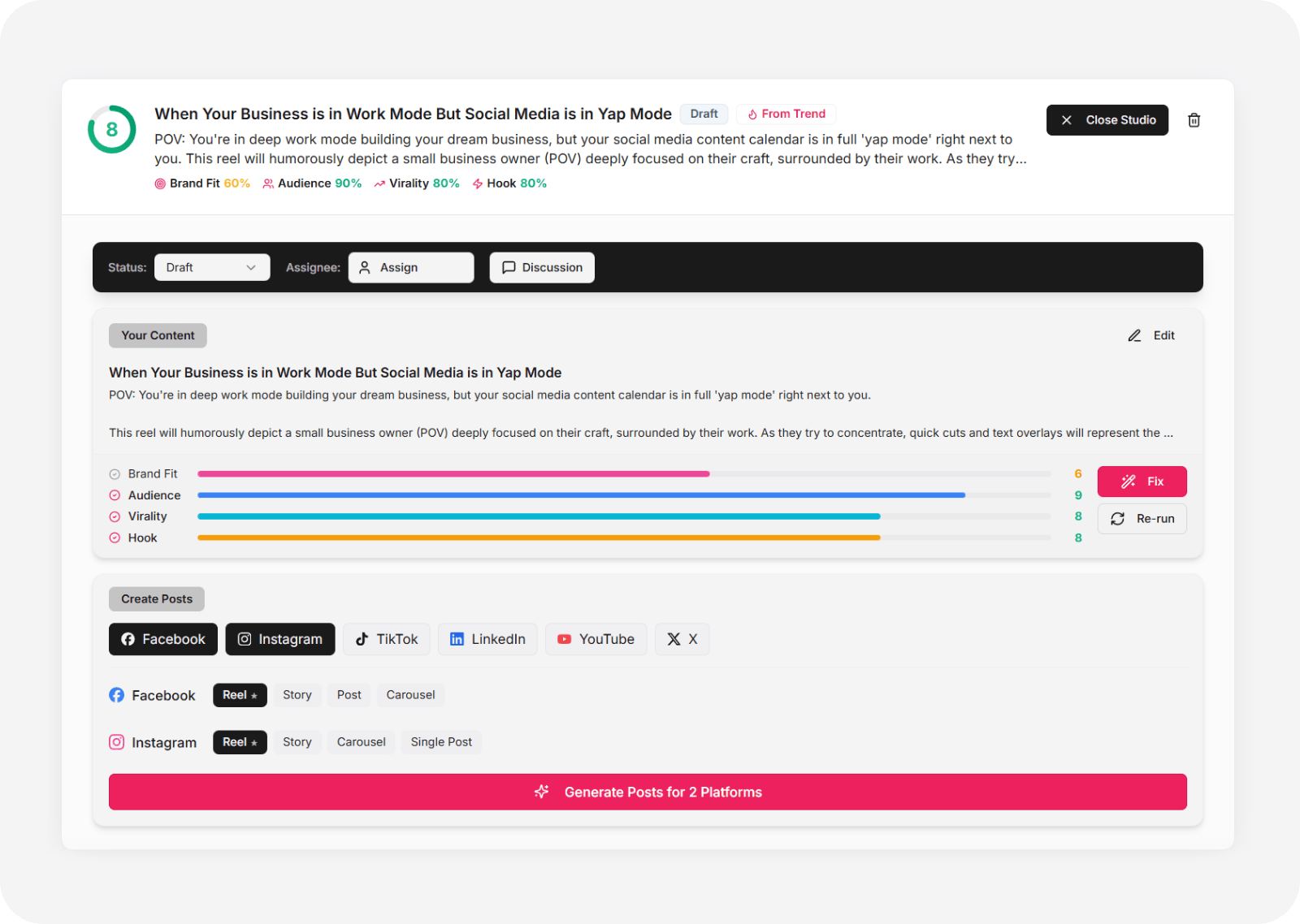 Turn research and trends into strong, structured content ideas. Refine, score, and approve ideas so teams know what to create before jumping into posting.